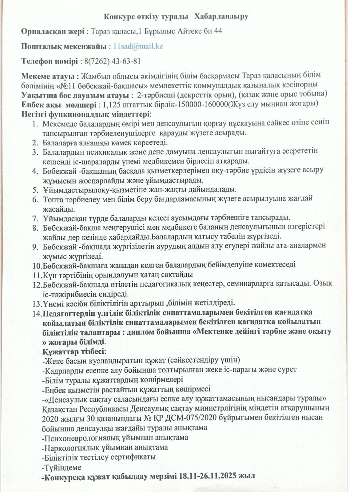 Конкурс өткізу туралы Хабарландыру » №11 "бөбекжай-бақшасы"
