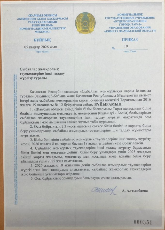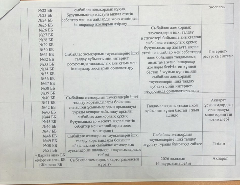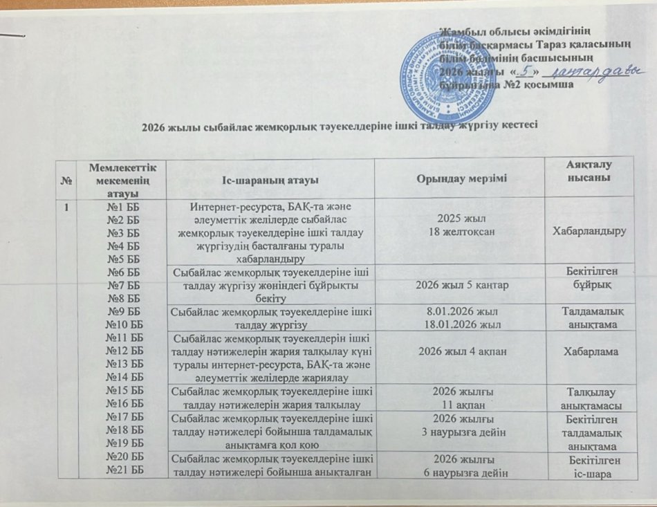 05 январь 2026 0 1 2 3 4 5 Сыбайлас жемқорлық тәуекелдеріне ішкі талдау жүргізу жөніндегі жұмыс жоспары
